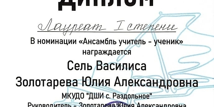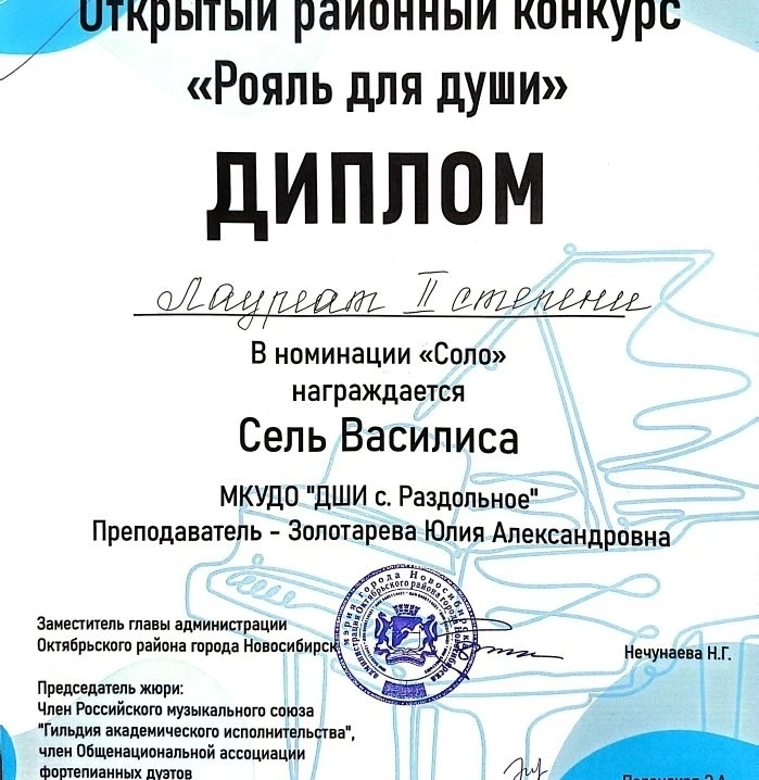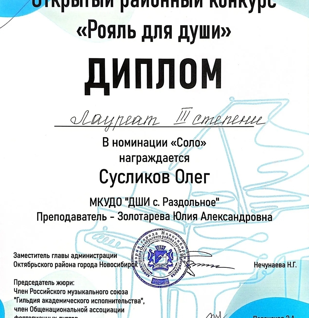 Сель Василиса, Сусликов Олег и их преподаватель Золотарёва Юлия Александровна учавствовали в открытом районном конкурсе "Рояль для души". Молодцы!