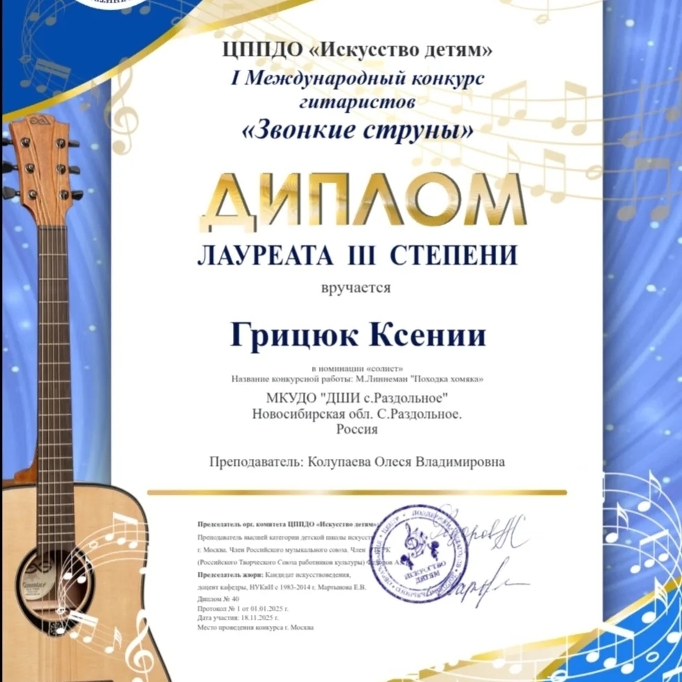 Грицюк Ксения участвовала в I Международном конкурсе гитаристов "Звонкие струны" и забрала свою награду! Молодец!!